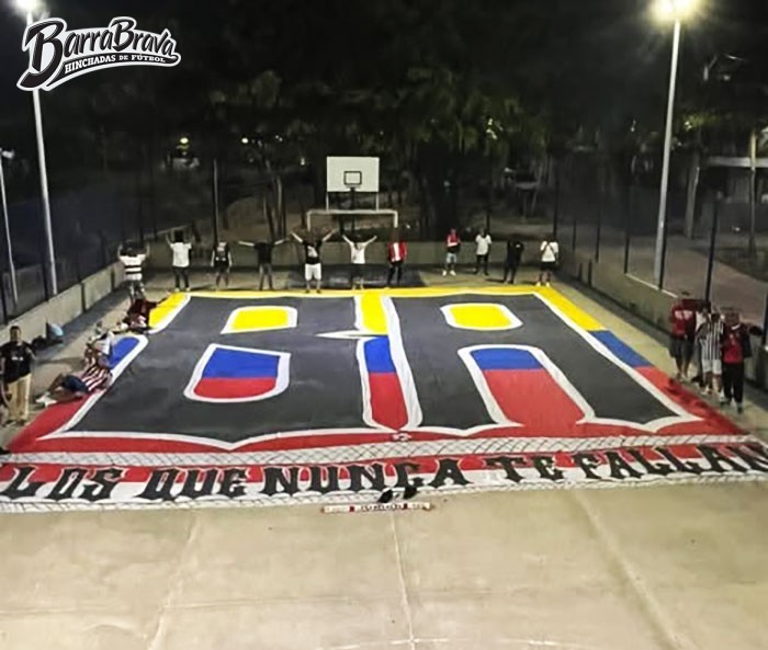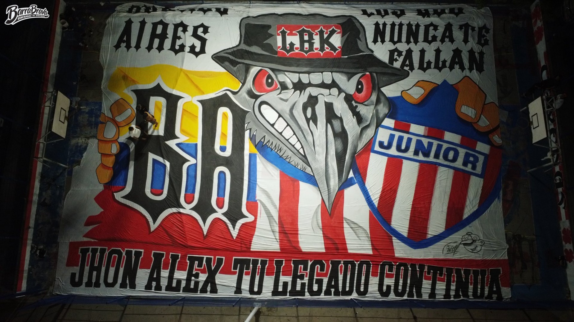 Trapos de la barra brava La Banda de Los Kuervos y hinchada del club de fútbol Junior de Barranquilla de Colombia